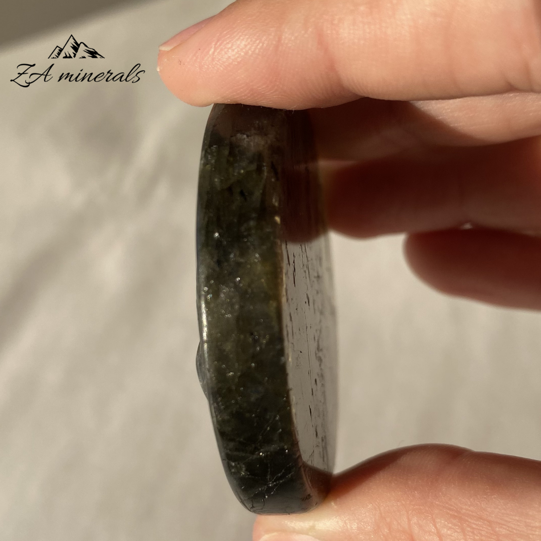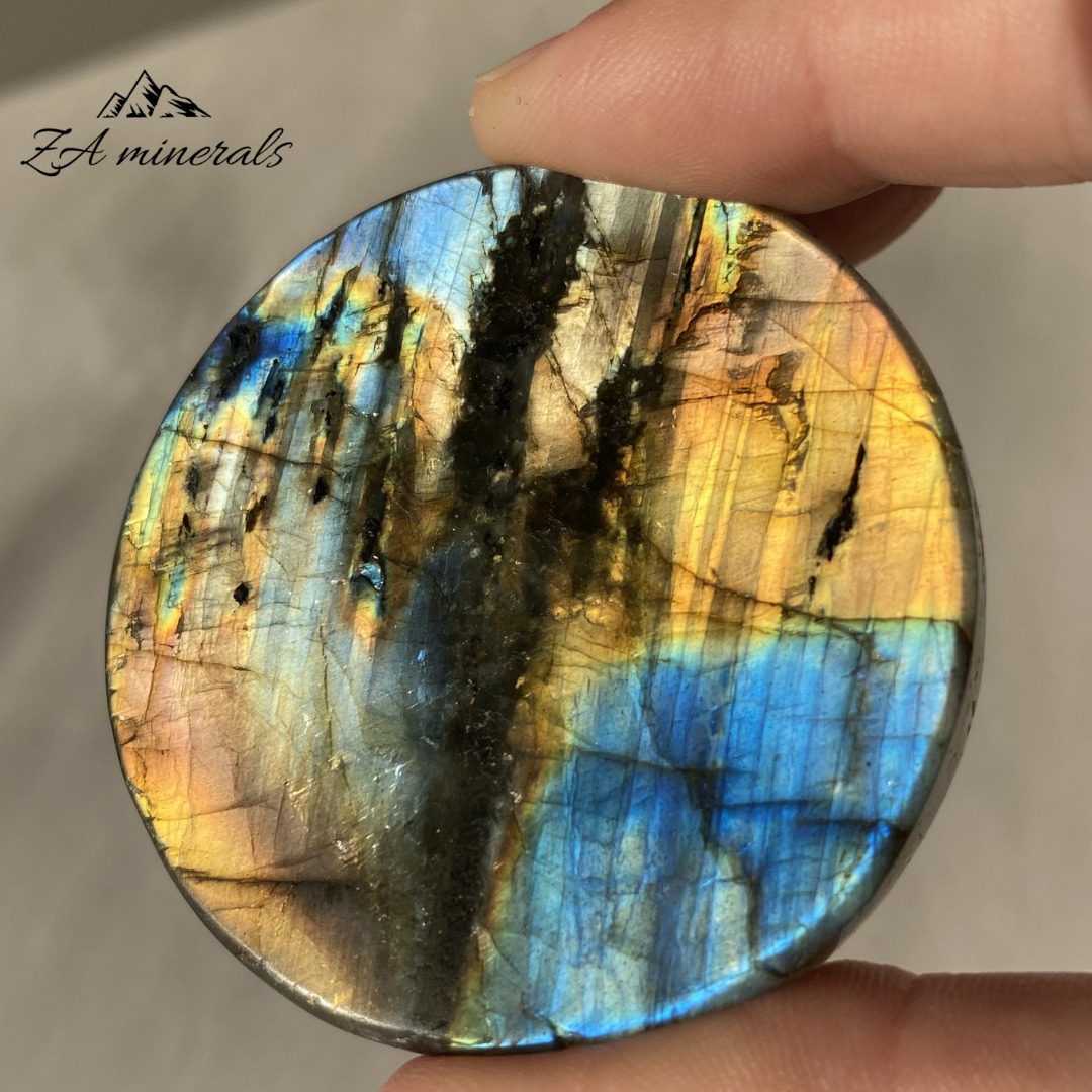 - Un hermoso trozo de labradorita áspero y llamativo que está pulido en 2 caras y tiene un búho y una calavera tallados, de Madagascar.